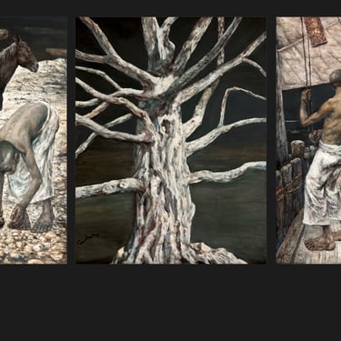 Cen’s paintings function as narrative myths, chronicling the journey of lost modern souls in search of home, while simultaneously serving as psychological records of this odyssey. In these visual recollections, one finds both tender, melancholic storytelling and profound laments for times long past. In Windy Wilderness, Weaned Calf, and Silver Land in Twilight, he distills the theme of loss into rustic narratives of companionship between humans and their animal counterparts, embedding the existential conflict of displacement into scenes suffused with poetry.Works such as Nomadic Life, Overlooking Muztagh Ata, Rawap, White Horse, The Hawk, Purgatory (Triptych), Sunset Over the Earth, and Mountain Winds are active narratives exploring the relationships between humans, animals, and nature. Yet, like music and stream-of-consciousness literature, Cen deliberately minimizes explicit narration, creating a vast interpretive space for the viewer to engage with his art on a personal level.