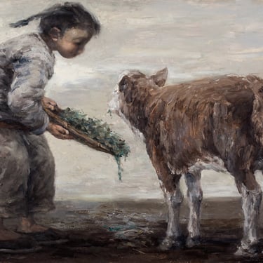 Cen Long’s paintings blend the rigor of Classical Realism with the restraint of Expressionism. Through classical poetry, young girls, mountain villagers, farmers, ethnic minorities, and even anthropomorphized animals, he constructs an imagined utopia, a sanctuary for the homesickness of modern people who have lost their sense of belonging. His works retain a simplicity and wistful sentimentality, along with a nostalgia that drifts ever further from the sensibilities of the present age. He makes no attempt to conceal his longing for a world of benevolence and humanity—his art is an act of remembrance and homage to these fading virtues.His admiration for great art has led him to impose upon himself an almost uncompromising standard for artistic technique and quality, which he regards as both his responsibility and his ultimate purpose. He clings to the creed of "art for art’s sake" with a steadfastness that feels almost anachronistic in our time. As a result, when we turn to his works—having grown accustomed to the vanity and exaggeration of postmodern imagery—we may feel as if we are encountering something from another era, imbued with a sense of distance and antiquity.