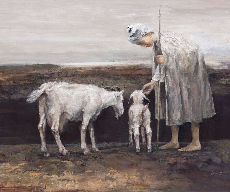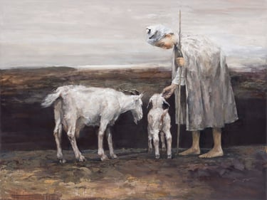 On the rocks cradled by distant mountains, a shepherdess feeds salt to her lambs. "Grow strong quickly, little ones, and I will sing you an ancient melody."