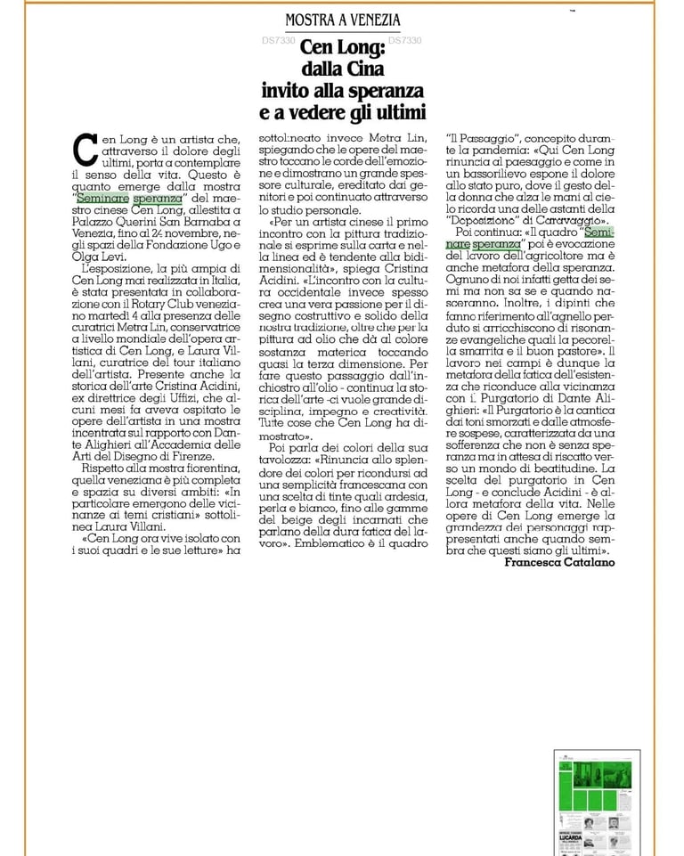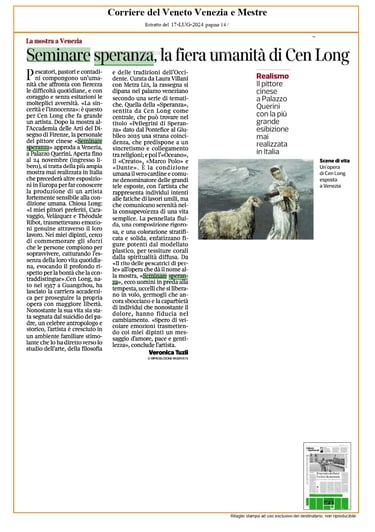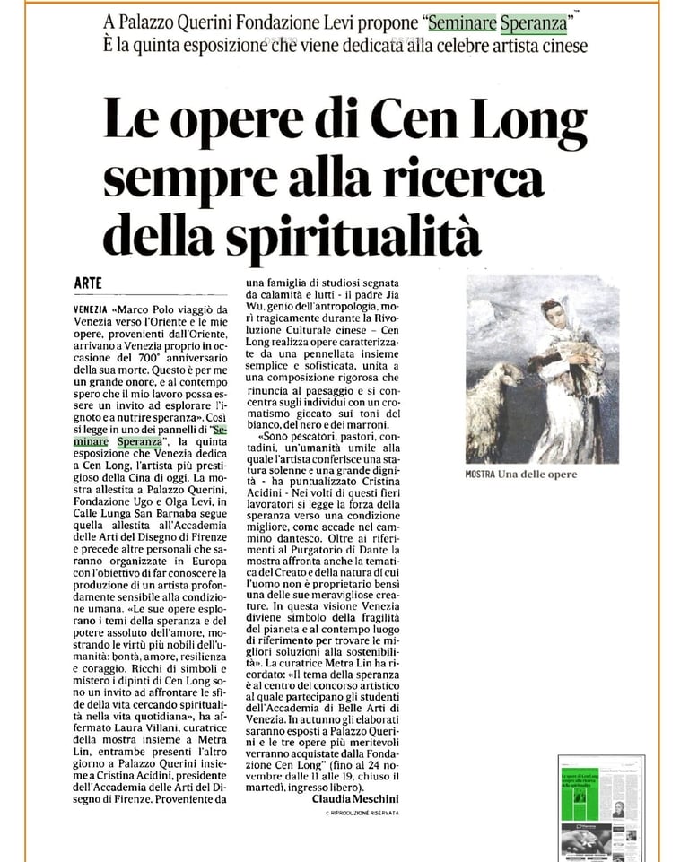 Cen Long è un artista che, attraverso il dolore degli ultimi, porta a contemplare il senso della vita. Questo è quanto emerge dalla mostra "Seminare speranza" del maestro cinese Cen Long, allestita a Palazzo Querini San Barnaba a Venezia, fino al 24 novembre, negli spazi della Fondazione Ugo e Olga Levi.
