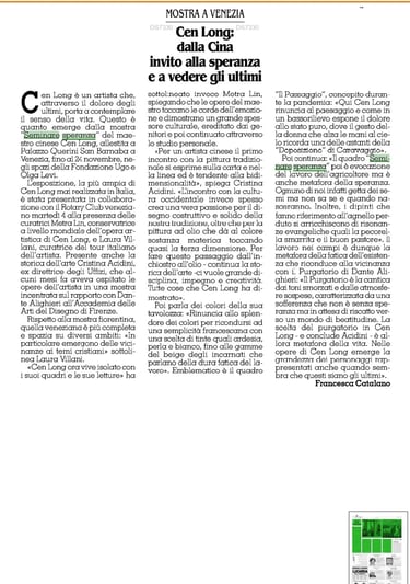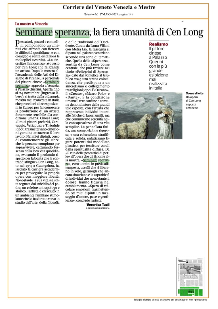 «Sono pescatori, pastori, contadini, un'umanità umile alla quale l'artista conferisce una statura solenne e una grande dignità» ha puntualizzato Cristina Acidini - Nei volti di questi fieri lavoratori si legge la forza della speranza verso una condizione migliore, come accade nel cammino dantesco. Oltre ai riferimenti al Purgatorio di Dante la mostra affronta anche le tematiche del Creato e della natura di cui l'uomo non è proprietario bensì una delle sue meravigliose creature. In questa visione Venezia diviene simbolo della fragilità del pianeta e al contempo luogo di riferimento per trovare le migliori soluzioni alla sostenibilità». La curatrice Metra Lin ha ricordato: «Il tema della speranza è al centro del concorso artistico al quale parteciperanno gli studenti dell'Accademia di Belle Arti di Venezia. In autunno gli elaborati saranno esposti a Palazzo Querini e le tre opere più meritevoli verranno acquistate dalla Fondazione Cen Long» (fino al 24 novembre dalle 11 alle 19, chiuso il martedì, ingresso libero).