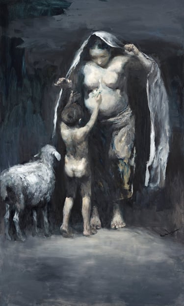 The son leads a woolly lamb, offering a delicate flower to his expectant mother, a quiet hymn to the new life soon to bloom. From the vast night sky, the angels’ voices descend in harmony: "Hail Mary, full of grace..."