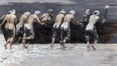 "Un gruppo di donne viste di schiena (e per la maggior parte nude dal bacino in su) spinge una barca di ritorno da un’uscita in mare alla ricerca di perle. Hanno un foulard che copre i capelli e sanno di dover riaffrontare il mare l’indomani ....