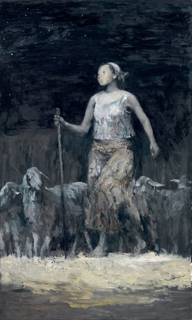 The night sky hangs low, a dark canvas adorned with countless stars— torches carried by angels as they drift through boundless heavens. With a heart trembling, I hastily gather the innocent flock, guiding them toward the faint light that beckons from afar. In the quiet depths of the night, laden with nostalgic love, the sobbing nightingale whispers its tender song.