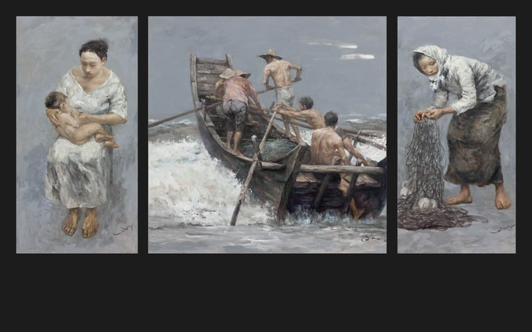 Wind Blown Sand Fisherman’s Family (left)Setting Sail to Fish (mid)Patching Nets (right),Oil on Canvas,