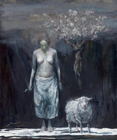 A blind child,seated by the roadside,holds a humble cross in his hands.His heart mirrors the calm of undisturbed waters.Above, a dove—messenger of the Gospel—soars through the sky,carrying the gentle blessings of love.