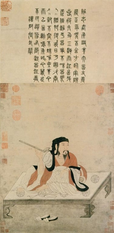 另外還有一幅是元代繪畫:〈諸葛亮畫像〉,作者佚名,吊軸,少有陳列。一次,故宮博物院舉辦古代人物肖像畫展,它被掛了出來。這是一幅工筆畫,頭戴黑巾,身穿暗紅衣裳和灰白色紗披上衣的諸葛亮屈盤著腿坐在床榻上,右手托著象徵其身份的如意,雙眼望著前方,若有所思。全畫顯淺灰色,人物膚色屬平塗但略作增強立體感的暈染。畫面單純、簡略,空蕩蕩的背景襯著灰白的床面,僅有一雙鞋擱於下前方,與畫中的人物在構圖上產生呼應。行雲流水般的游絲描線使人物更顯得飄逸、灑脫。全畫沒有任何背景的描繪,但是空曠的灰色底層卻毫不顯得單調,反而形成一股莫名的氣團簇擁著主體。