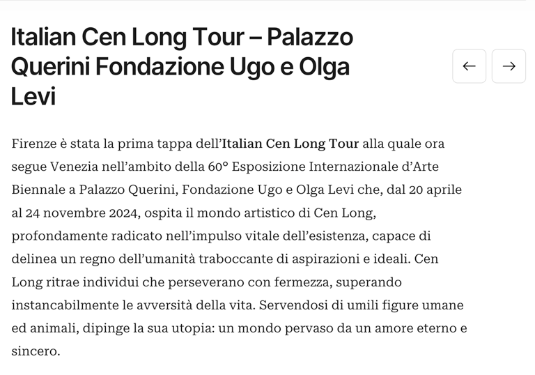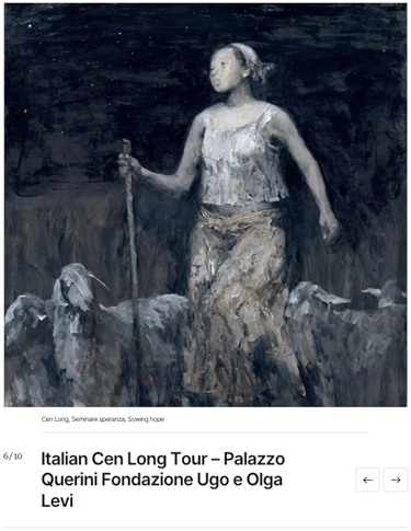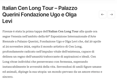 佛羅倫斯是意大利岑龍之旅的第一站,現在威尼斯也將成為第60屆國際藝術展覽會的一部分,在奎里尼宮,烏戈和奧爾加·萊維基金會舉辦。從2024年4月20日到11月24日,它將展示岑龍的藝術世界,這是一個深深扎根於生命的生機中的,能夠勾勒出一個充滿抱負和理想的人類王國。岑龍描繪了堅定不移、不知疲倦地克服生活逆境的人物。他利用謙卑的人類和動物形象描繪了自己的烏托邦:一個充滿永恆和真摯愛的世界。