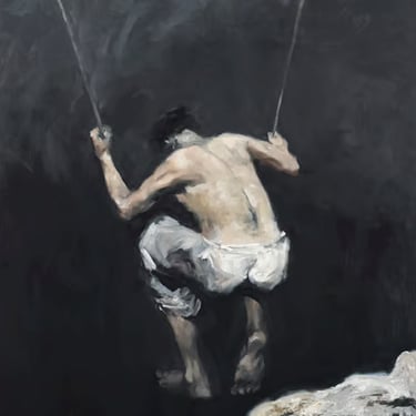 希臘神話的薛西弗斯因為觸怒眾神而被諸神懲罰,要他不斷將一塊巨石推上山峰。但每當他把石頭推上山峰後,那塊巨石都會從山峰滾回到山底,而薛西弗斯得要不斷重複把石頭推上山峰,永無休止。卡繆在著作《薛西弗斯的神話》中描述了薛西弗斯很清楚意識到自己荒謬的命運,但他打算用自己的意志去承受這一切苦難,並「享受」著這苦難。於是,懲罰對他來說就不是懲罰了。卡繆認為薛西弗斯是幸福的,他認為人必須接受現實,承認生命的荒謬性才有戰勝無望的可能性。岑龍的作品《孤獨的水手》(2018)描繪的是日復一日在船上工作的水手,他接受生命的安排,對於各種生存的挑戰他沒有任何怨言。他是孤獨的,因為他得獨自一人接受一切苦難,但他同時是享受這孤獨的,因為他知道他別無選擇。勞動者是岑龍繪畫中最重要的一個符號,他經常將自身藏匿於主角的背後。對岑龍來說,生命總是伴隨著苦難,只有正面迎接並進而克服,沒有別條路可以走。水手的身體看來顯得有些赢弱,卻蕴藏着無限張力,他頑強的迎風而戰不言放棄。這幅畫歌頌了勞動者對於生存的韌性,同時也表現出岑龍作為一個畫家,從不願意隨風逐流,儘管孤寂卻永往直前的決心。