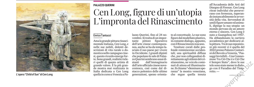 這些畫作融合了深刻的西方回憶;一種普遍的精神性,儘管不直接與基督教的風格相聯繫,卻傳達了期待和啟示的內容。此次威尼斯展覽名為“播種希望”,緊隨佛羅倫薩美術學院展覽之後。岑龍描繪了那些堅定不移、不斷克服生活逆境的個體。他通過描繪謙卑的人物和動物形象,描繪了他心中的烏托邦:一個充滿永恆和真摯之愛的世界。岑龍1957年出生於廣州。他放棄了學術生涯,專注於繪畫。在他最近的展覽中,有2022年在威尼斯的波沃洛宮舉辦的“看不見的通道——存在與永恆之間的聯繫”,其中他的畫作與丁托列托的《天堂》進行對話。